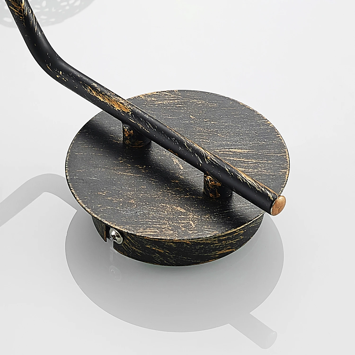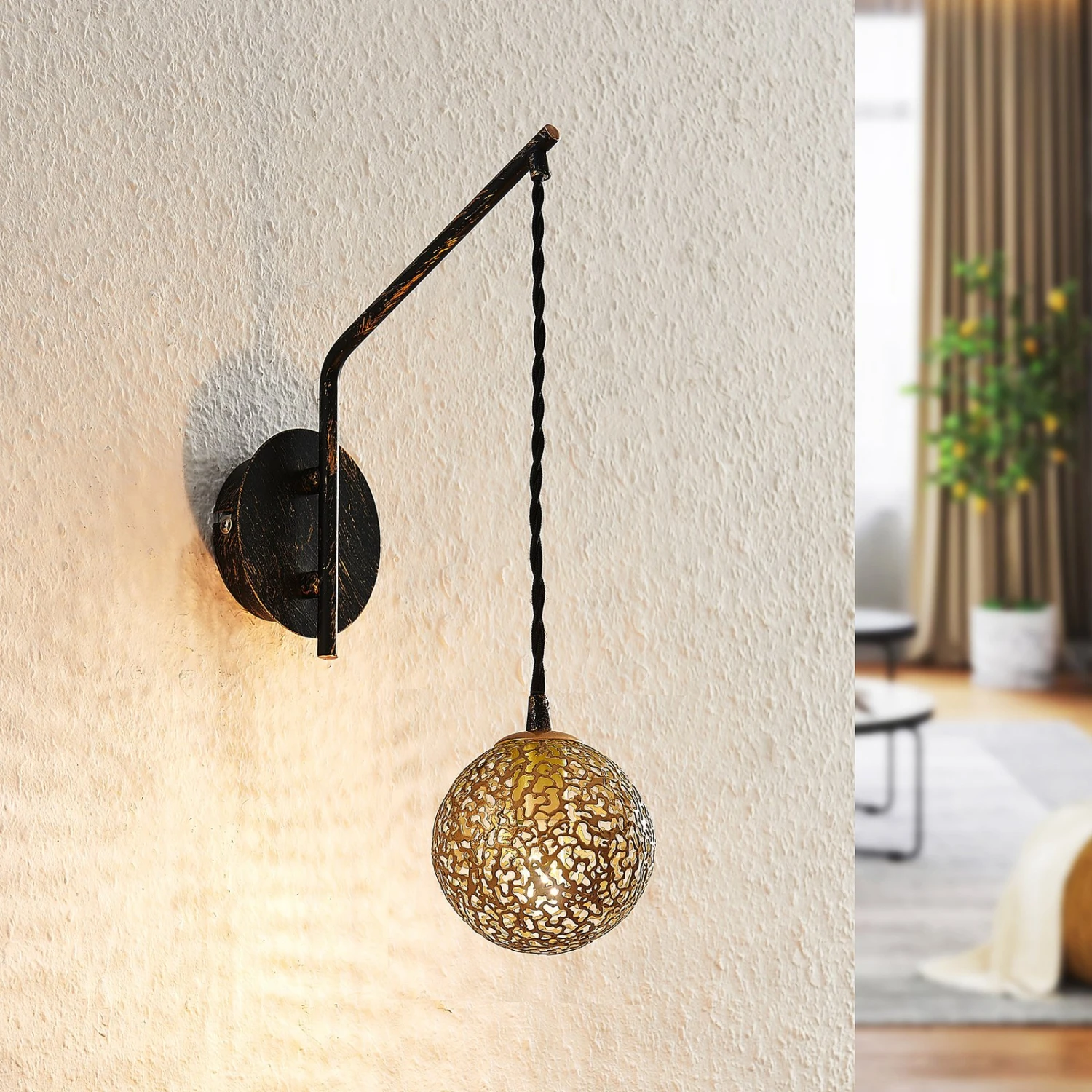Die Wandleuchte Zale besteht aus einer runden Halterung, an welcher ein langer Leuchtenarm befestigt ist. An dem Leuchtenarm befindet sich eine goldene Kugel, die Platz für ein Leuchtmittel hat. Das Leuchtmittel ist nicht im Lieferumfang enthalten und kann frei gewählt werden. Da der Lampenschirm über feine Aussparungen verfügt, dringt das Licht nur gedämpft in den Raum und bekommt dabei einen goldenen Schimmer verliehen. Das Muster im orientalischen Stil kreiert zusätzlich faszinierende Lichteffekte mit einem ausgewogenen Anteil von Licht und Schatten.