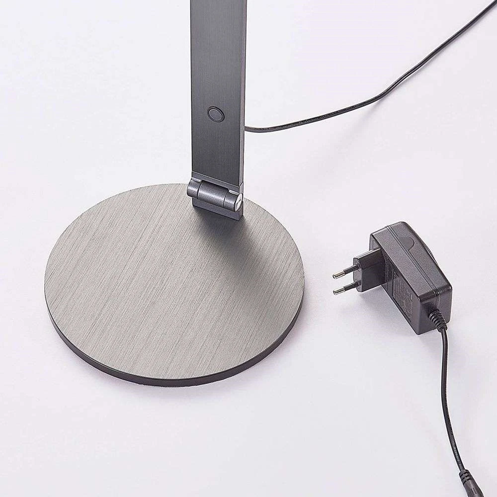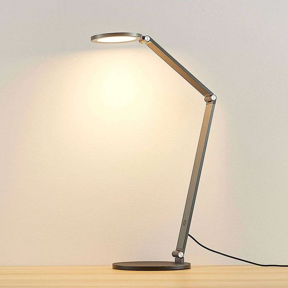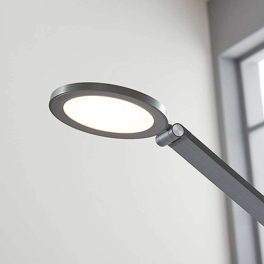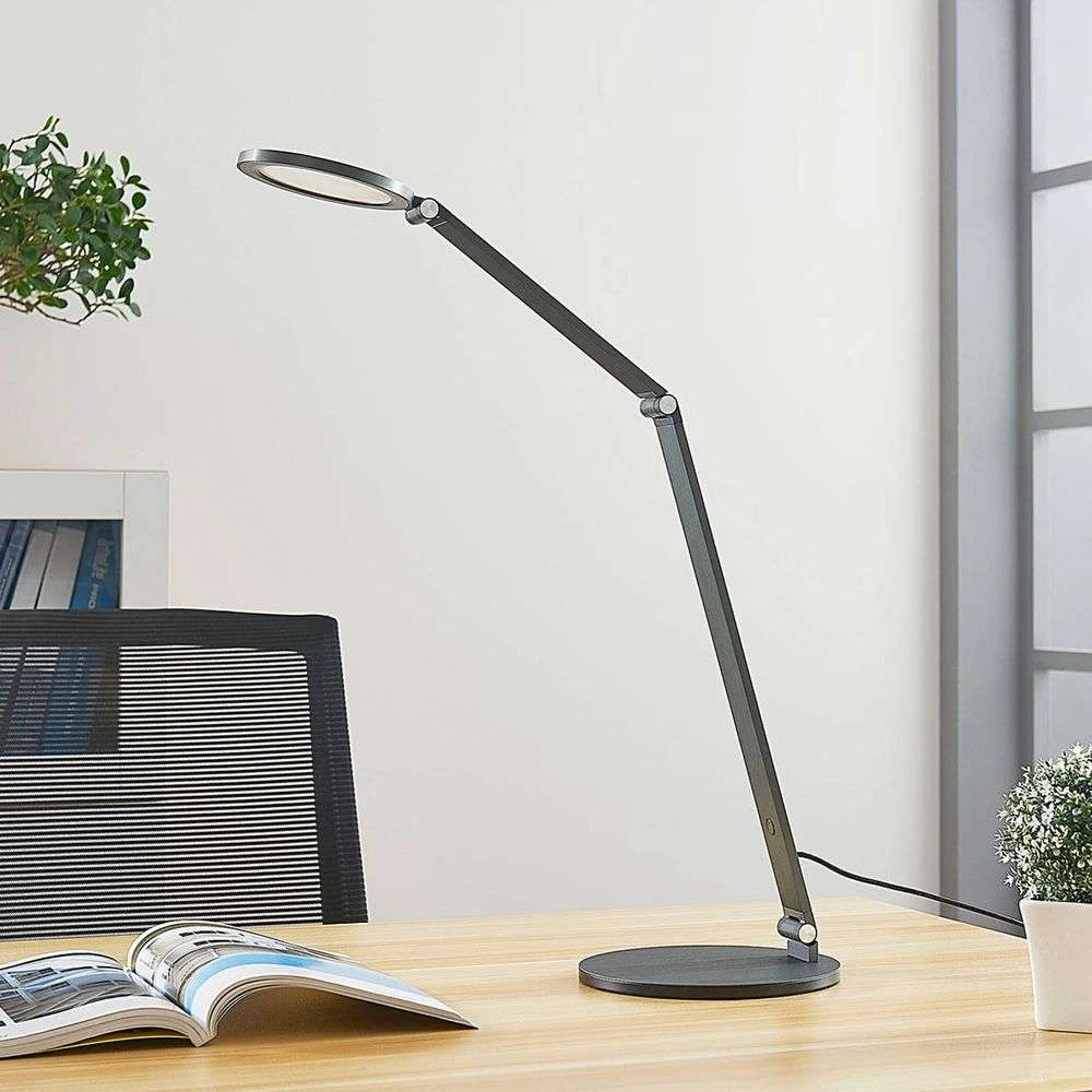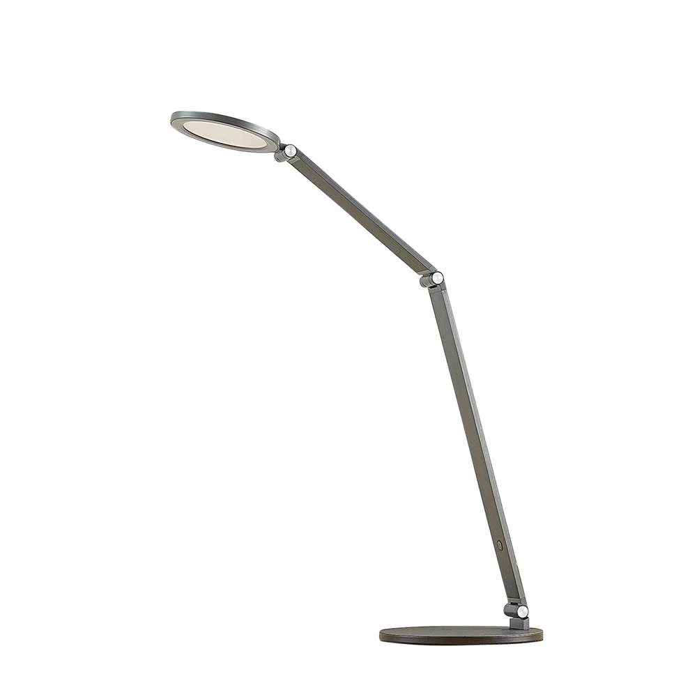 Der runde Leuchtenkopf ist über ein zweiteiliges Stativ mit dem passenden Sockel verbunden, das insgesamt drei Gelenke hat. Dies ermöglicht eine unübertroffene Flexibilität bei der Einstellung der Lichtrichtung. Das Licht der integrierten LED strahlt in einem effizienten und direkten Strahl, der die Tischoberfläche gut ausleuchtet.