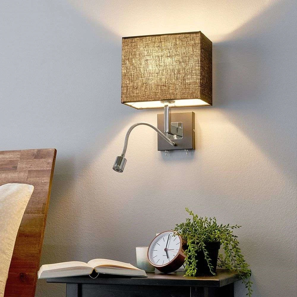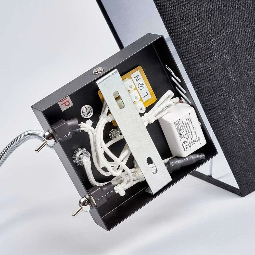 Eine Lichtquelle wird von einem quadratischen Stoffschirm in einem exklusiven, dunklen Farbton bedeckt, der beim Einschalten der Leuchte für ein besonders stimmungsvolles Licht sorgt. Die andere ist eine elegante Leselampe, die an einem verstellbaren Flexarm befestigt ist. So kann man zwischen einem diffusen Zusatzlicht für den Raum oder einem fokussierten Licht für die Arbeit oder das Lesen wählen.